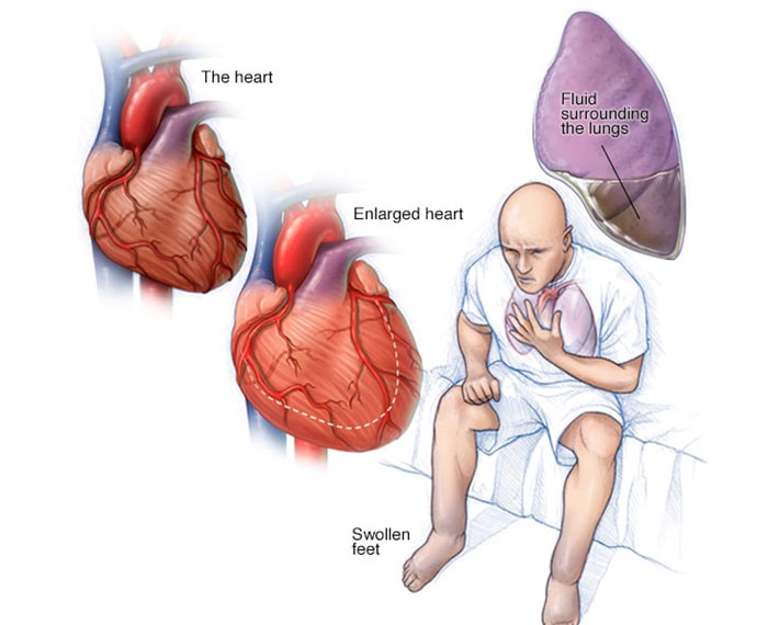 Heart failure occurs when the heart cannot pump blood properly. This leads to building up of fluids in the lungs, causing shortness of breath. Sometimes fluid accumulates in whole body leading to swollen legs and distended abdomen.